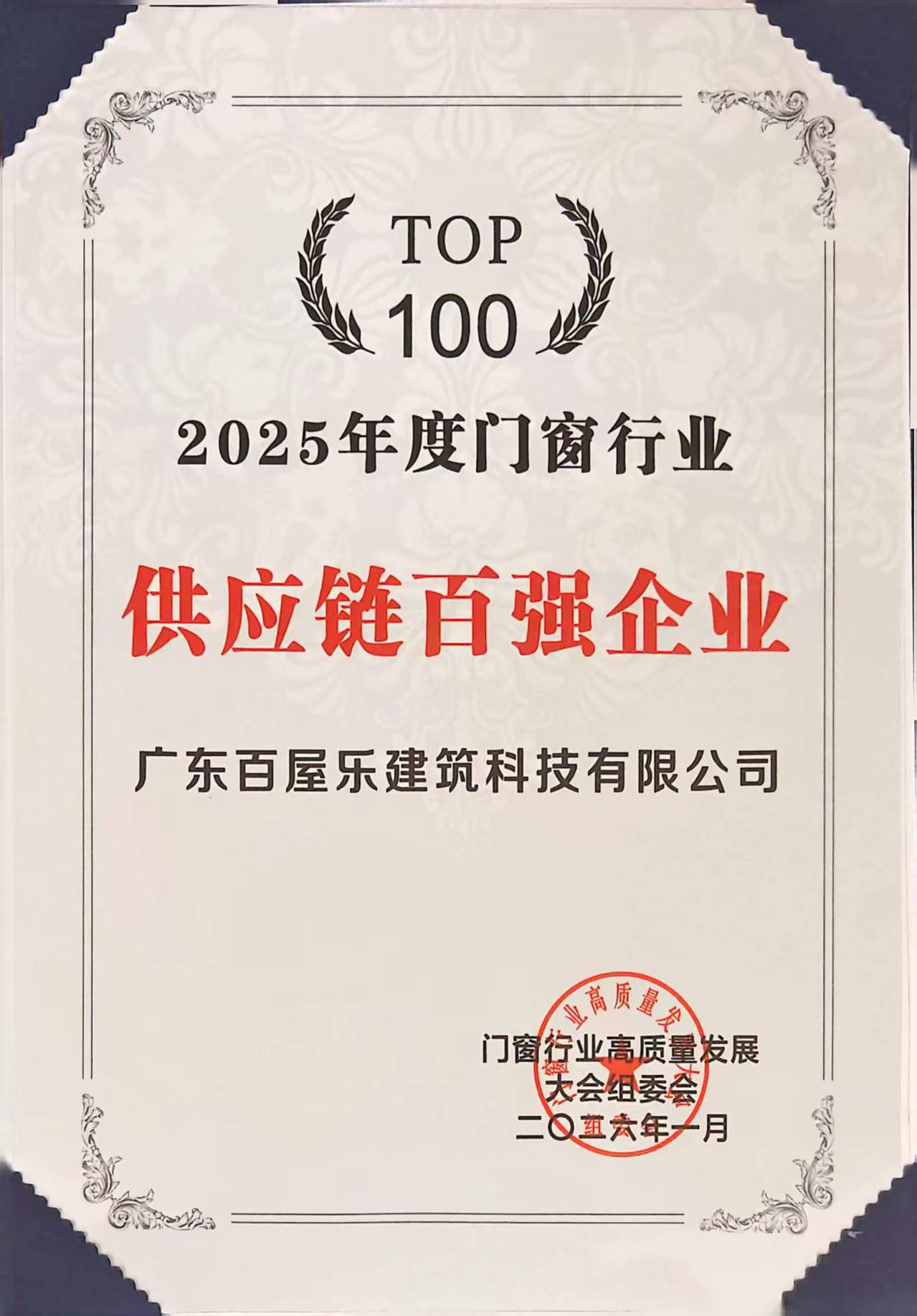 百屋乐荣膺"2025年度门窗行业供应链百强企业"!